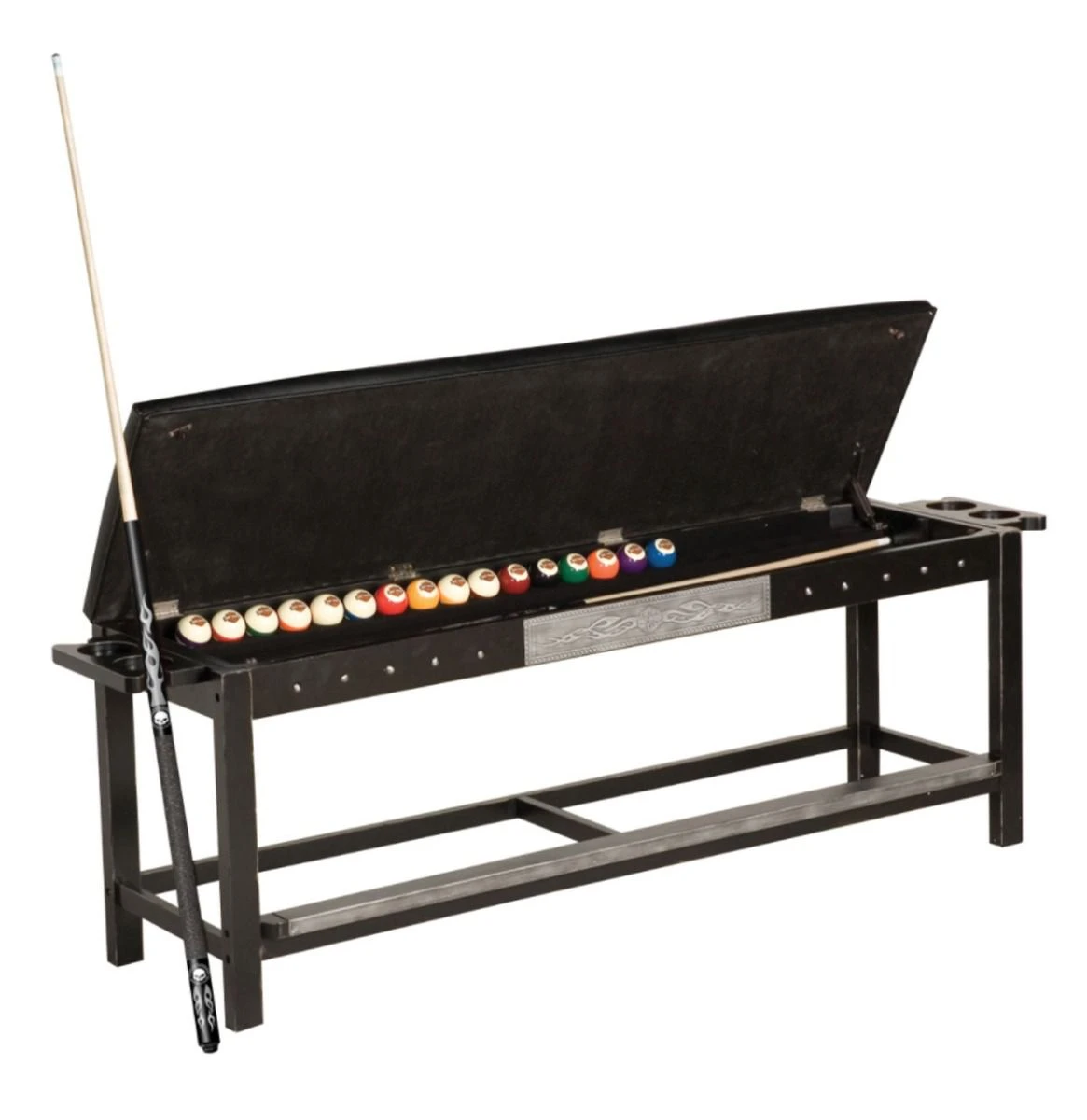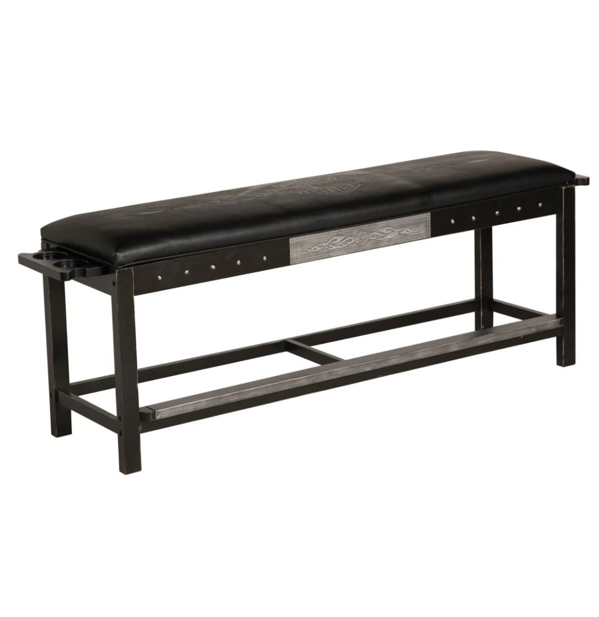 Increase seating space for viewing that intense game of billiards with this comfortable Harley-Davidson Spectator Bench. Embossed Bar & Shield flame leatherette seat lifts up to store billiard balls and cues. Bench is embellished with studs and a custom etched Bar & Shield flame metal plate and equipped with cup holders and cue rests on both sides. This distressed Vintage Black hand rubbed finish features antique pewter accents. Item also available in a Heritage Brown finish with antique brass accents (HDL-13600-H). Easy assembly required. Billiard accessories sold separately. Dimension: 26″ H x 72″ W x 17″ D (66 cm x 1.83 cm x 43 cm)