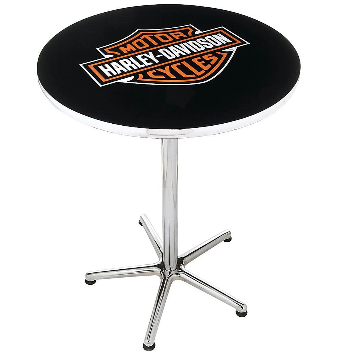 H-D® Bar & Shield Cafe Table With bold H-D® graphics and classic five star chrome base the H-D® Bar & Shield Cafe Table makes a clear statement in any room. Includes durable acrylic top with chrome accent trim. Easy assembly required. Recommended for indoor use only. Dimensions: 30″ Diameter X 41″H 76cm Dia x 104cm H
