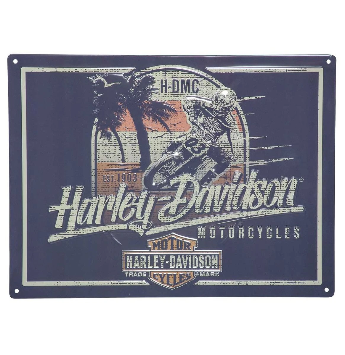 Retro H-D Beach design with palm trees and racer looks great on a tin sign! Embossed accents and vibrant colors add depth and dimension. Smooth edges for safe handling. Includes holes for easy hanging.