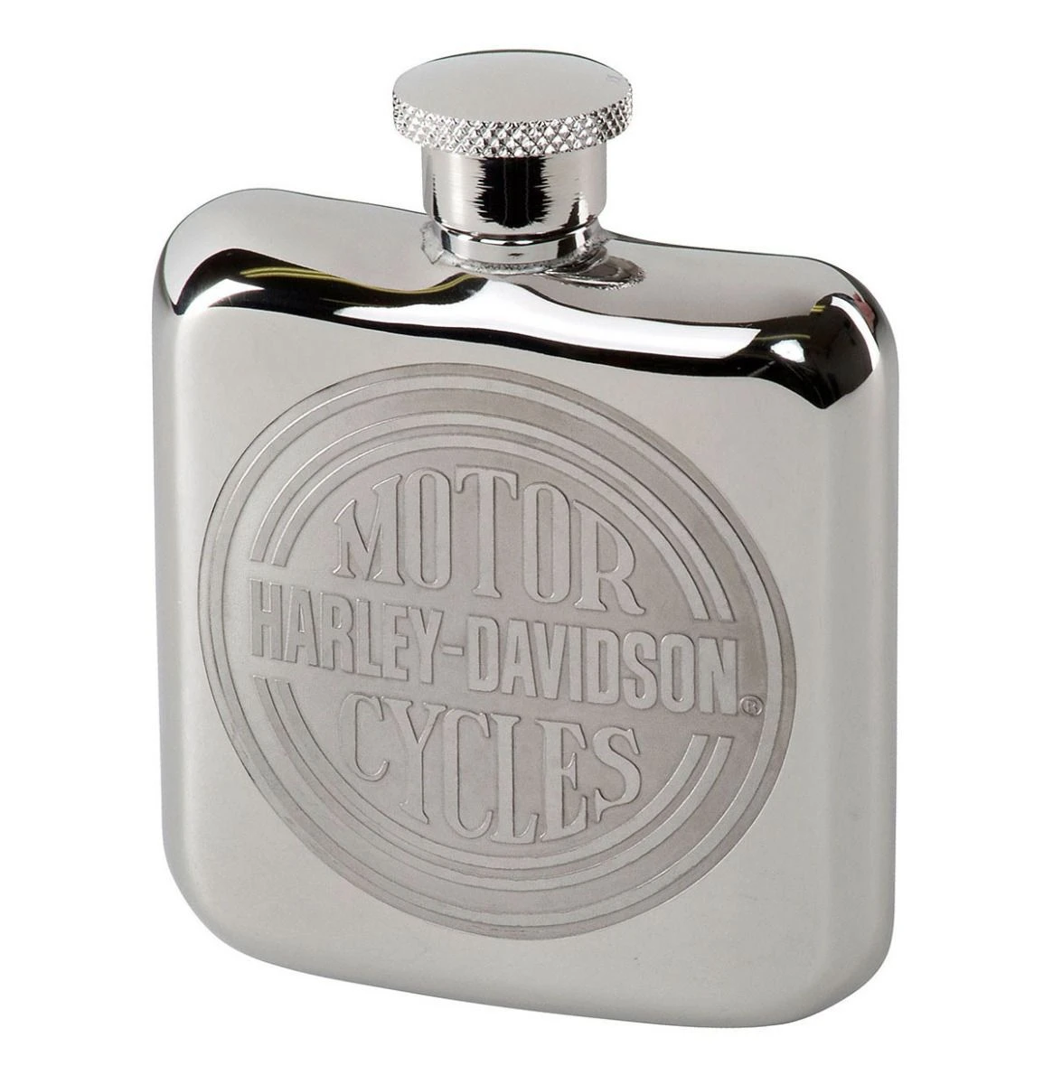 120 ml stainless steel hip flask. Engraved Harley-Davidson Circle logo on front.