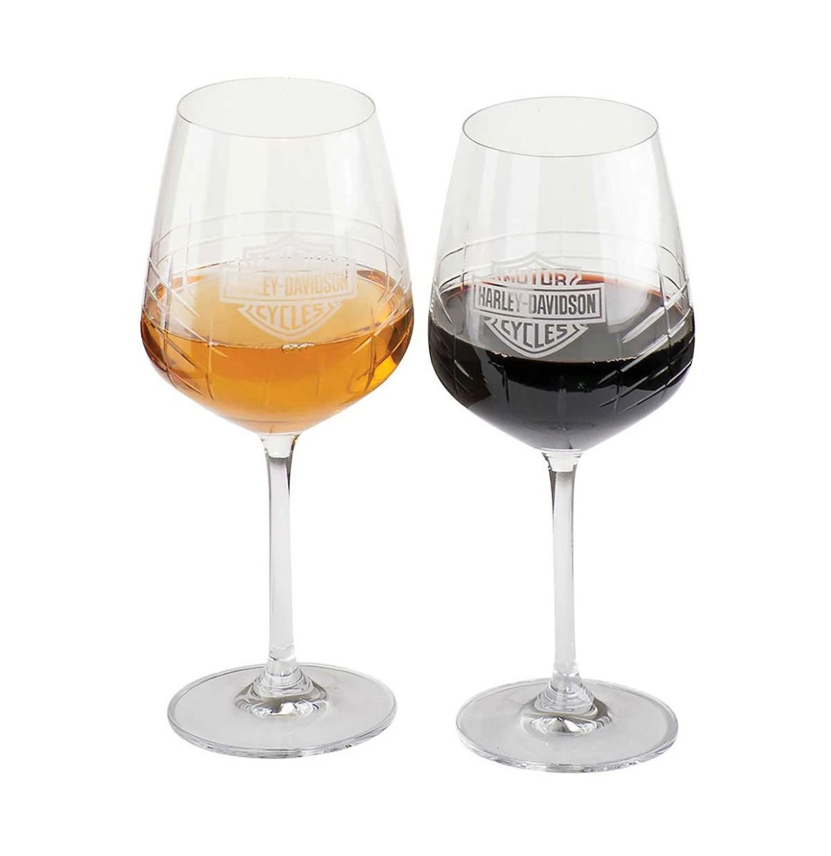 Set of two 20 oz. / 600 ml hand cut crystal wine glasses with frosted Bar & Shield logo. Hand wash only.