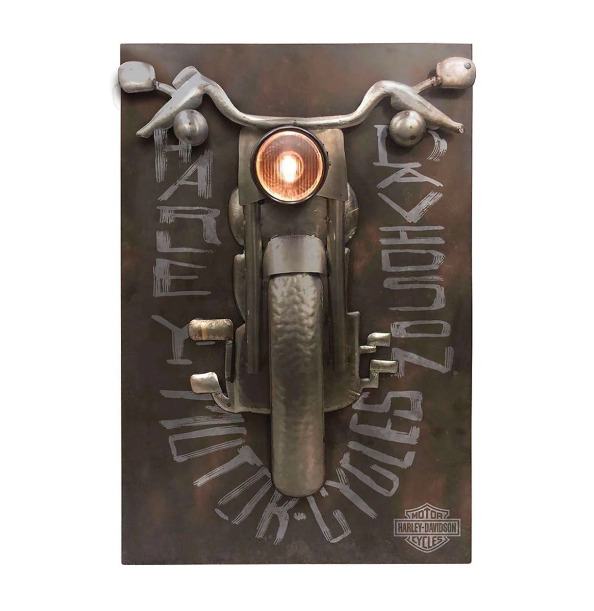 Limited edition, hand crafted metal wall art features a working headlight and custom cut motorcycle for added dimension. Distressed finish with Bar & Shield logo. Requires two AA batteries (not included).