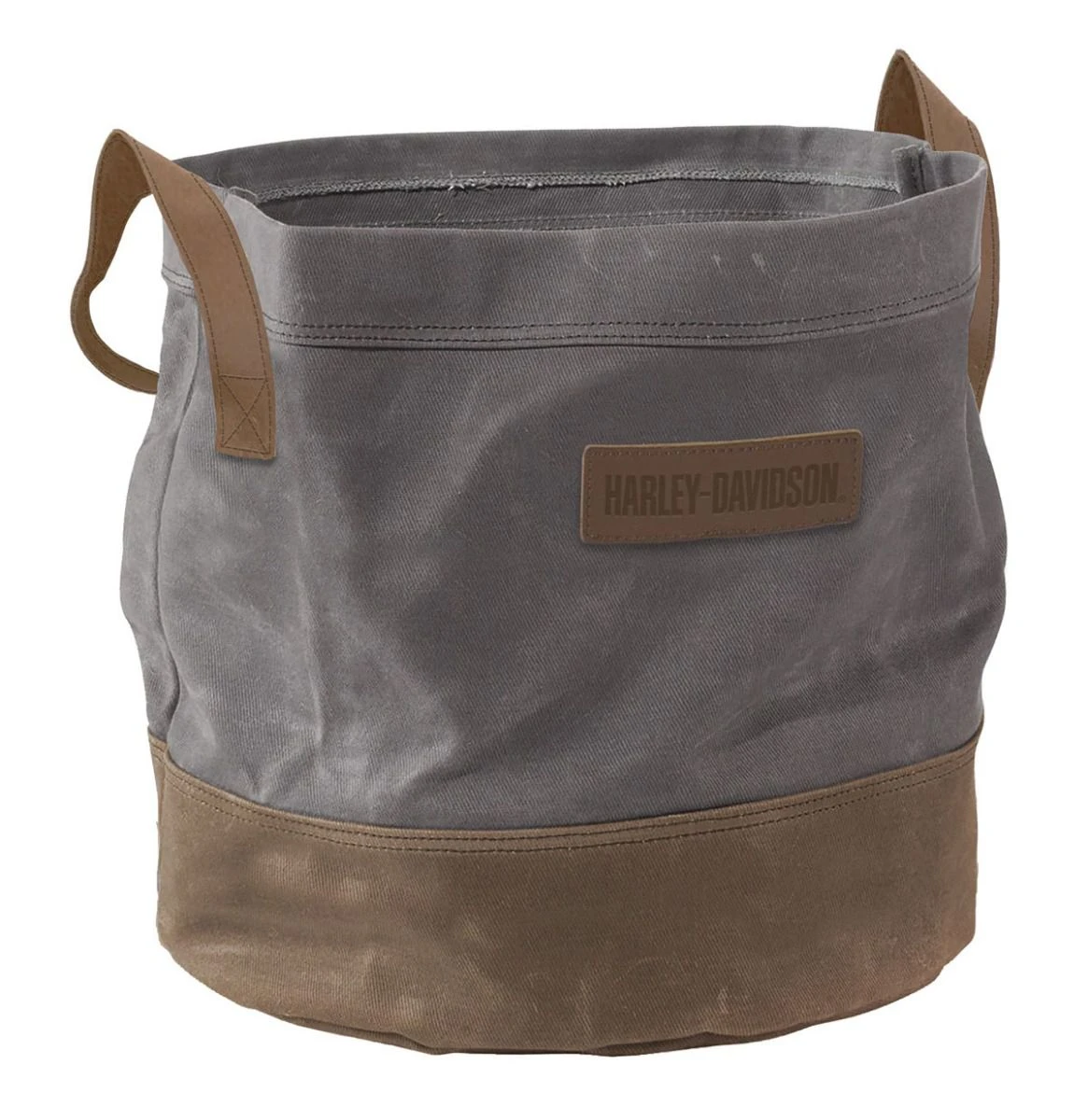 Grey waxed canvas storage bin with faux leather handles and embossed Harley-Davidson® tag on front.