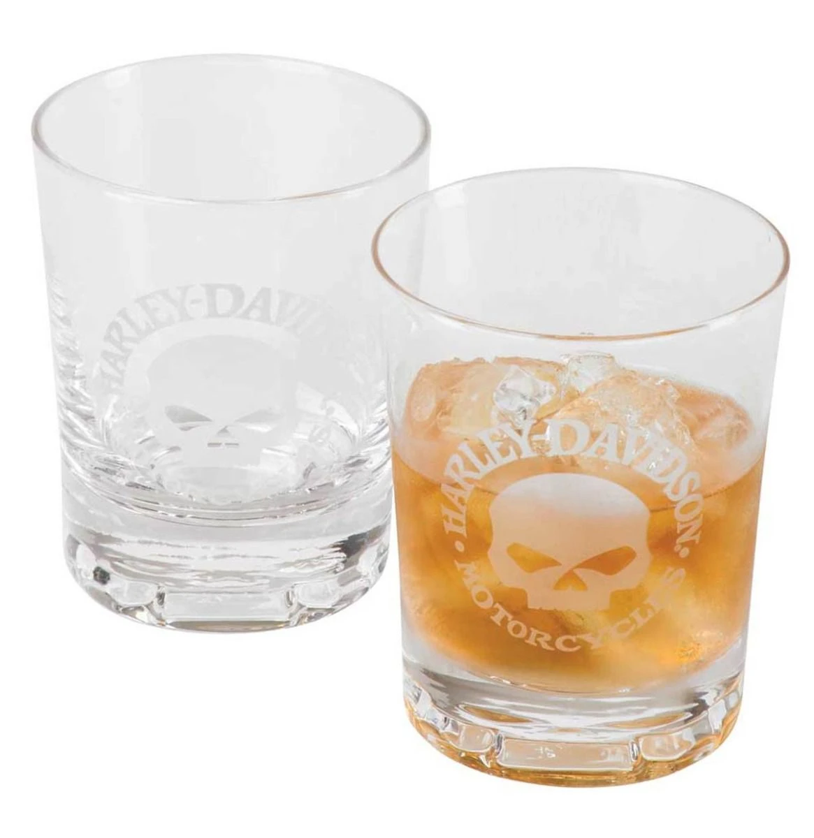 Harley-Davidson® Skull Tumbler Set, HDL-18799. Set of two 300 ml. glass tumblers with frosted Willie G Skull logos. Custom tooled skull logo in base of glass. The perfect addition to your home bar!