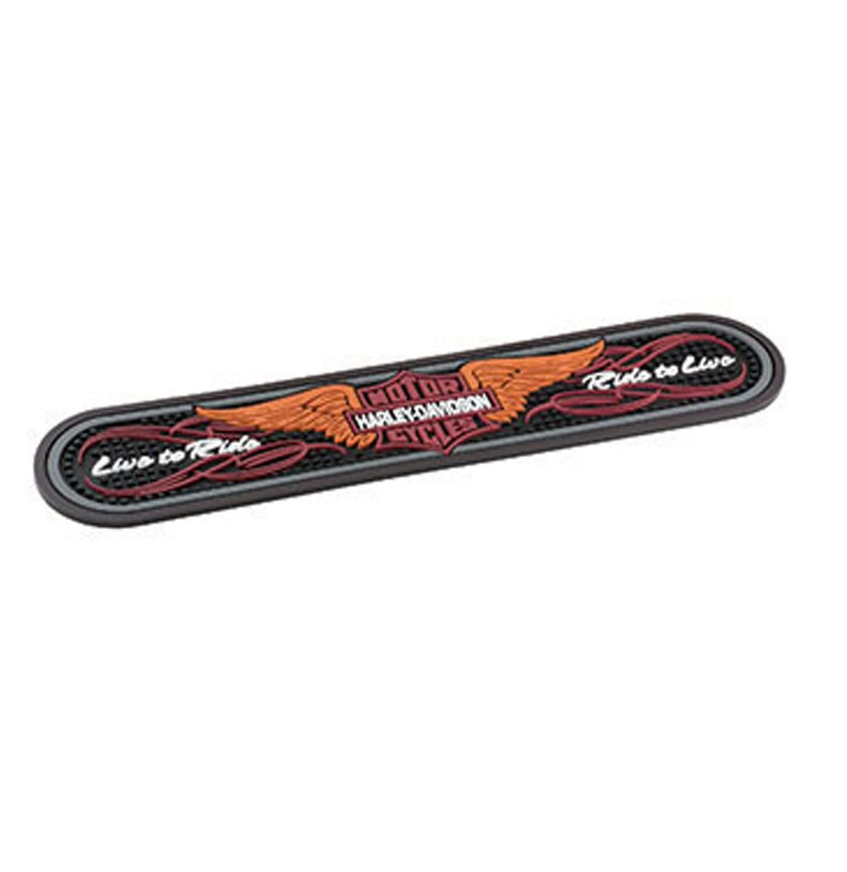 Custom tooled, no slip H-D™ Winged Bar & Shield Beverage Mat protects your bar from spills and over pours. Contoured rubber design is top rack dishwasher safe. Dimensions:19”L x 4”W x 0.25”D / 48 cm x 10 cm x 0.6 cm